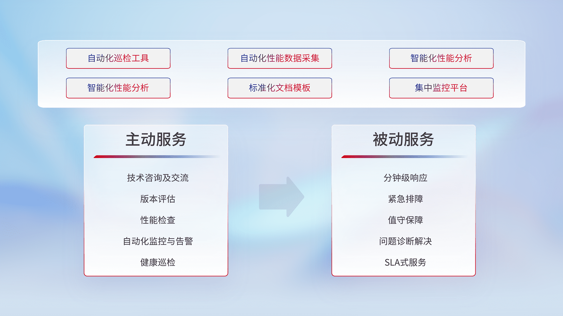 智能化工具和标准化文档,,保障服务质量,,提供主动服务(包含技术咨询、、版本评估、、、、性能检查、、自动化监控与告警、、健康巡检)和被动服务包含(分钟级响应、、、紧急排障、、、值守保障、、、、问题诊断解决、、SLA服务)。。。